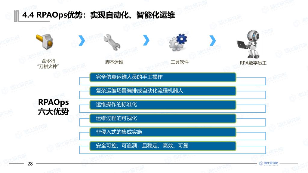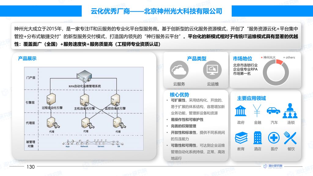 報(bào)告中由神州光(guāng)大(dà)率先提出并落φ ∞±地(dì)的(de)RPAOps混合雲運維服∞↕務管理(lǐ)系統備受關注,神州光(guān↕÷≤¶g)大(dà)RPAOps通(tōng)過将各種運維腳本、命∑★φ∏令、操作(zuò)、API等運維操作(zuò)元,$↑用(yòng)邏輯調度串聯起來(lái),實現(xiàn)了(le)IT÷"↕運維過程的(de)自(zì)動化(huàλ✔")與智能(néng)化(huà),一(yī)鍵主備切換、一(yī)鍵應用(∑$yòng)級啓停、自(zì)動化(huà)跨雲備份等,助力廣大(dà)企∞ ★業(yè)提升運維水(shuǐ)平,控制(zhì)運維風(fēng)險,✔→降低(dī)IT運營成本。